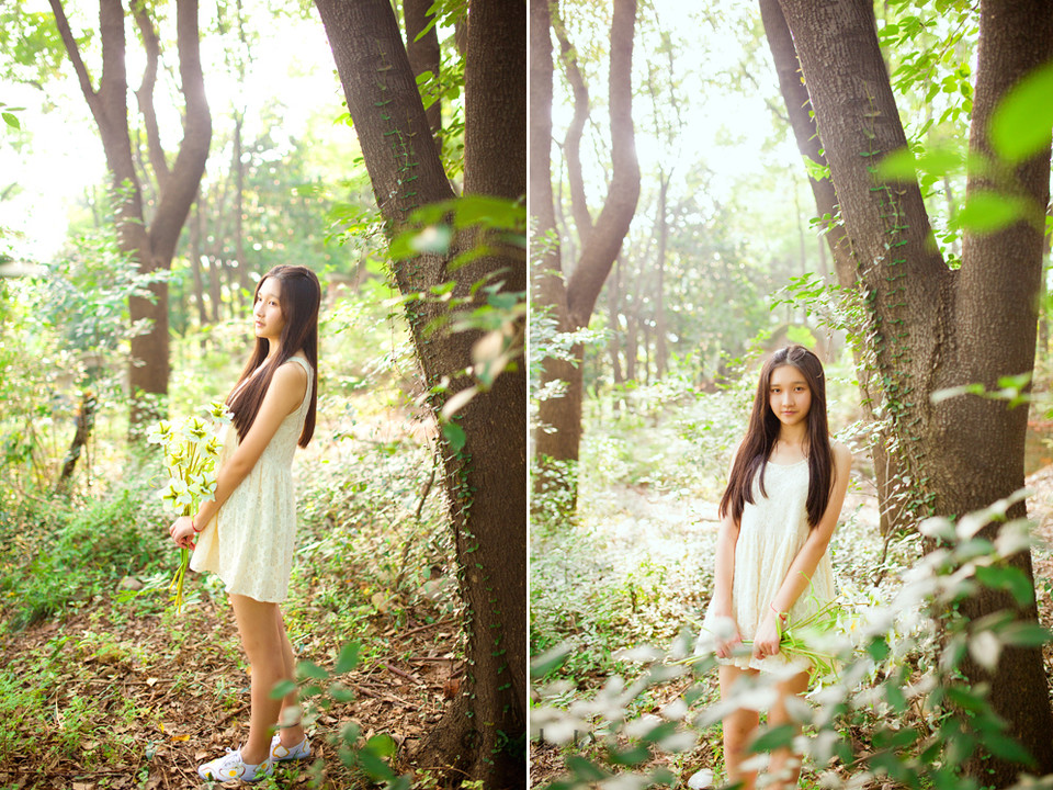 森林里面出现的碎花裙美少女