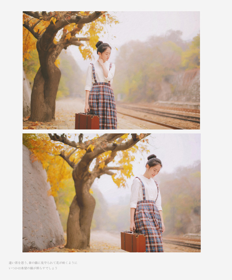 秋日的清纯女子铁轨图